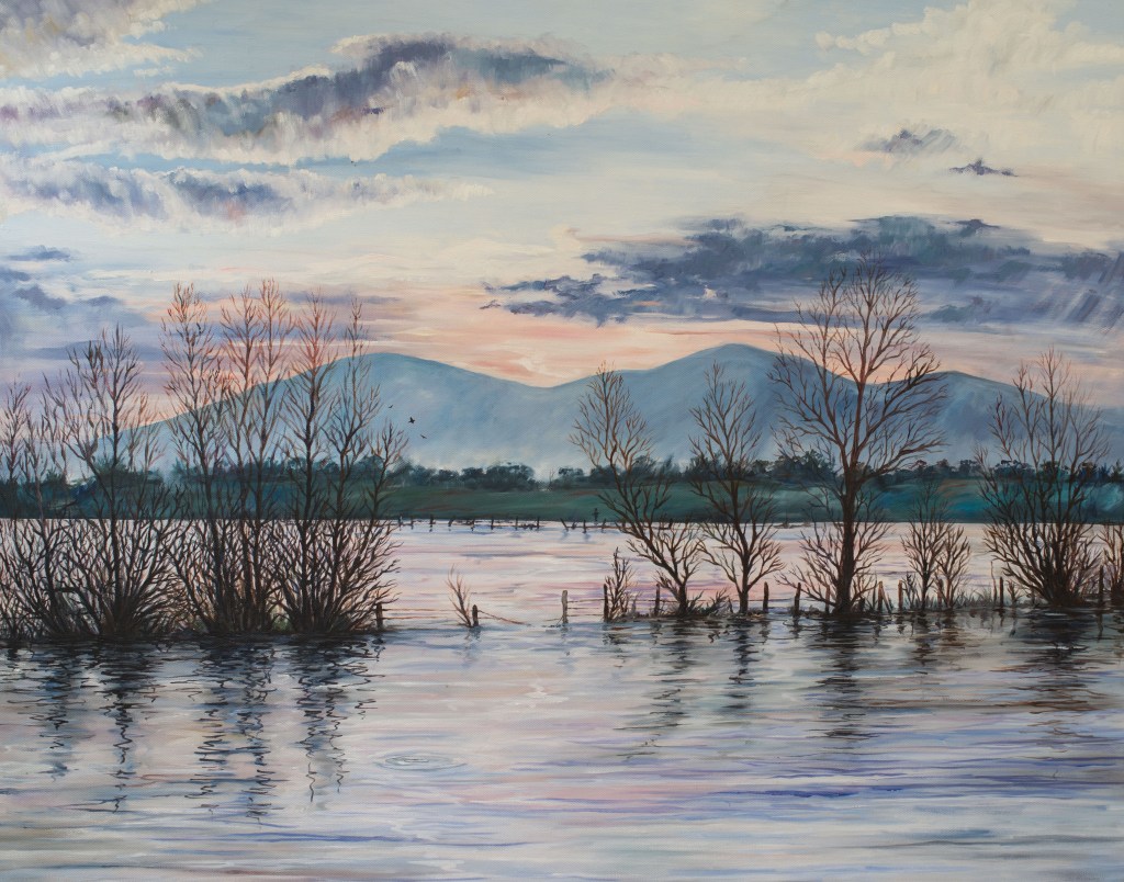 One evening in 1991 after the rain had stopped, a friend phoned me to ask did I want to take a ride to see the flood. We found ourselves staring at the hills, across the flooded seven. The silence, the peace, the water, and a brief memory of an art teacher showing me how to paint the Malverns purple, made the need to paint bubble up again. Not just the moving flood waters, but the lost innocence of nights spent on those hills watching the light from Worcestershire twinkle. All the hope and dreams of all that could be….at that moment I needed to find my way back to being happy. I took a single photo to remind me…and as the waters became inky and the night air chilled, I pushed the cheap camera into my pocket with a single image waiting to be developed.