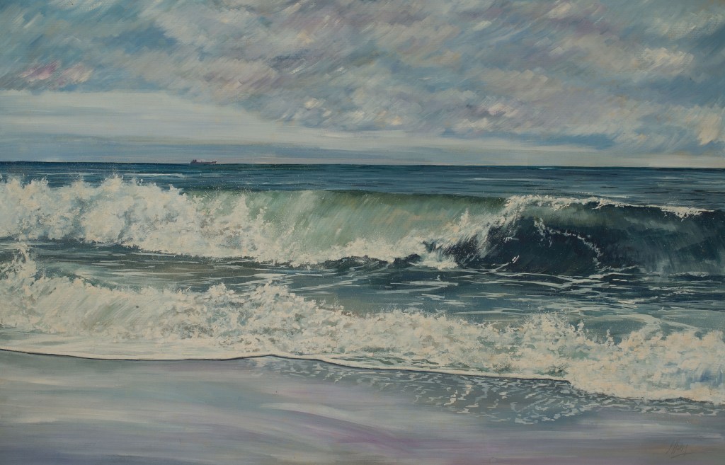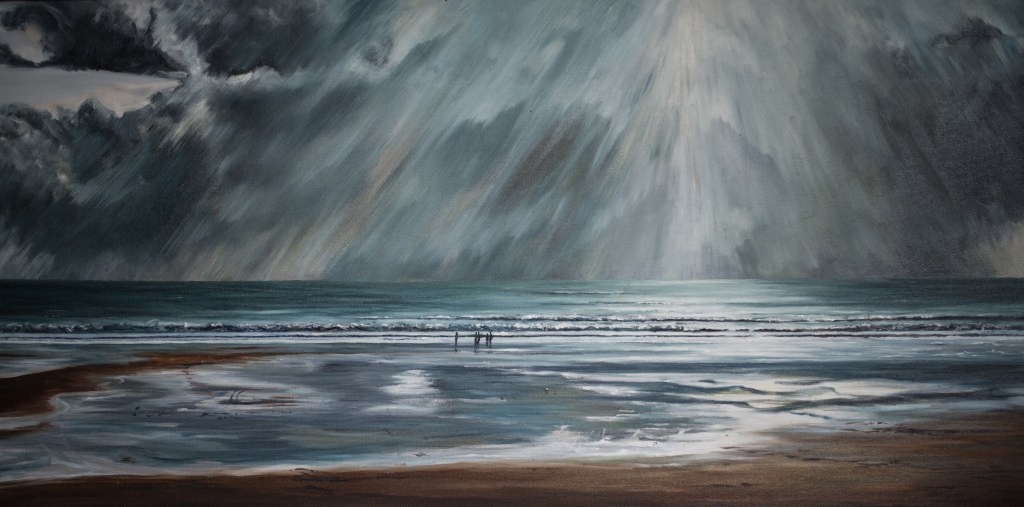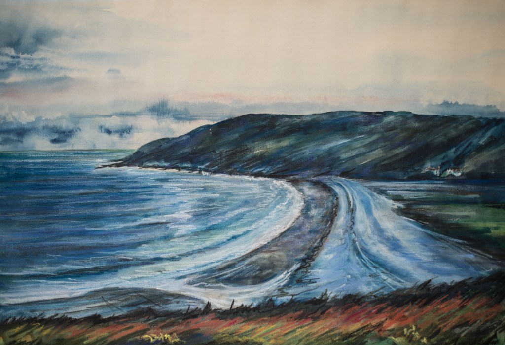 Caswell Bay at Dawn. Gouashe on board. Swansea bay with Tanker. (sold)Caswell High Tide. Oil On Canvas.Stormy dog walk. Oil on Canvas small. A5/4/3 prints availablePulldu. Watercolour and Pastel